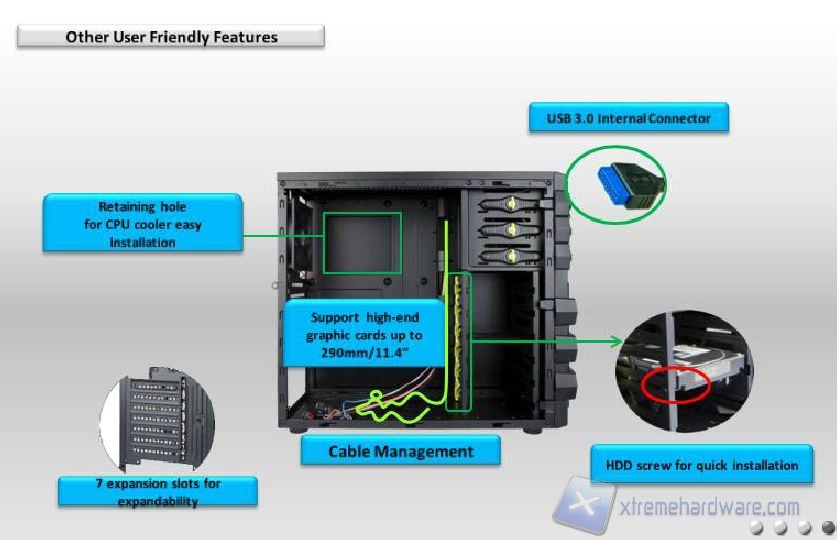 La fessura d’installazione per il backplate posteriore è spaziosa e permetterà tranquillamente il montaggio di dissipatori complessi. Lo spazio tra la scheda madre ed eventuali ventole superiori purtroppo però è ridottissimo, tanto da inficiare persino sul montaggio di ventole. Consigliamo di aumentare l’altezza, o provvedere diversamente. Ovviamente non sarà consigliabile montare un radiatore.