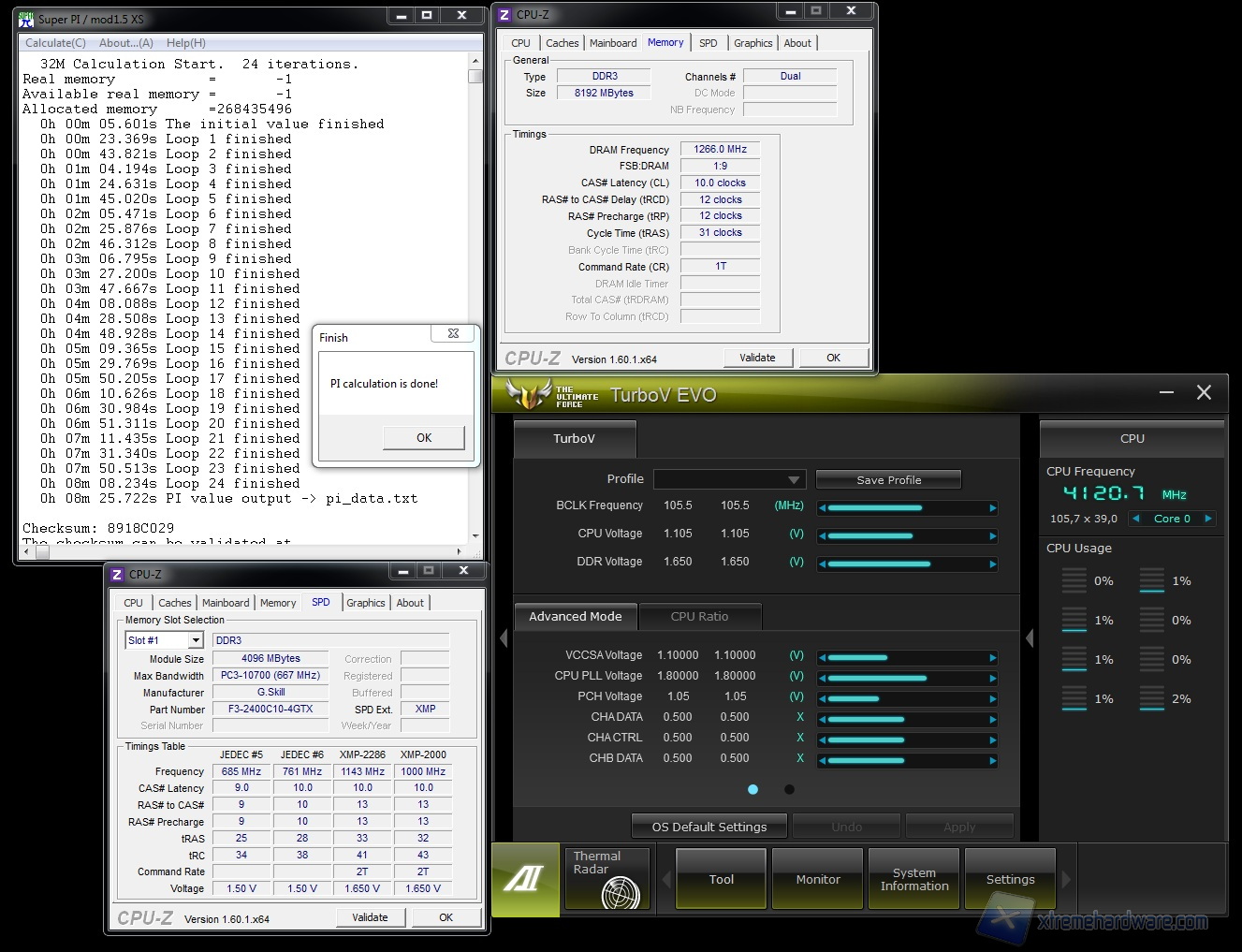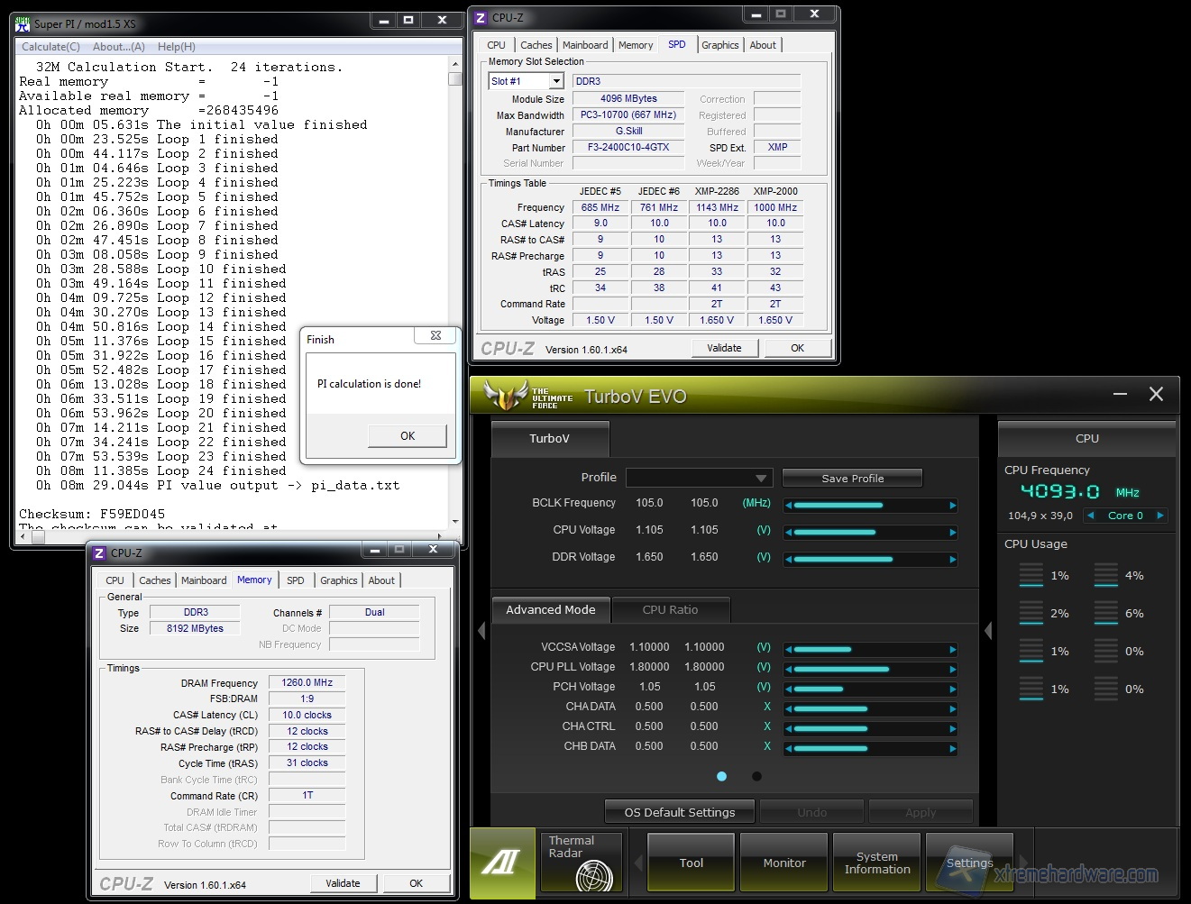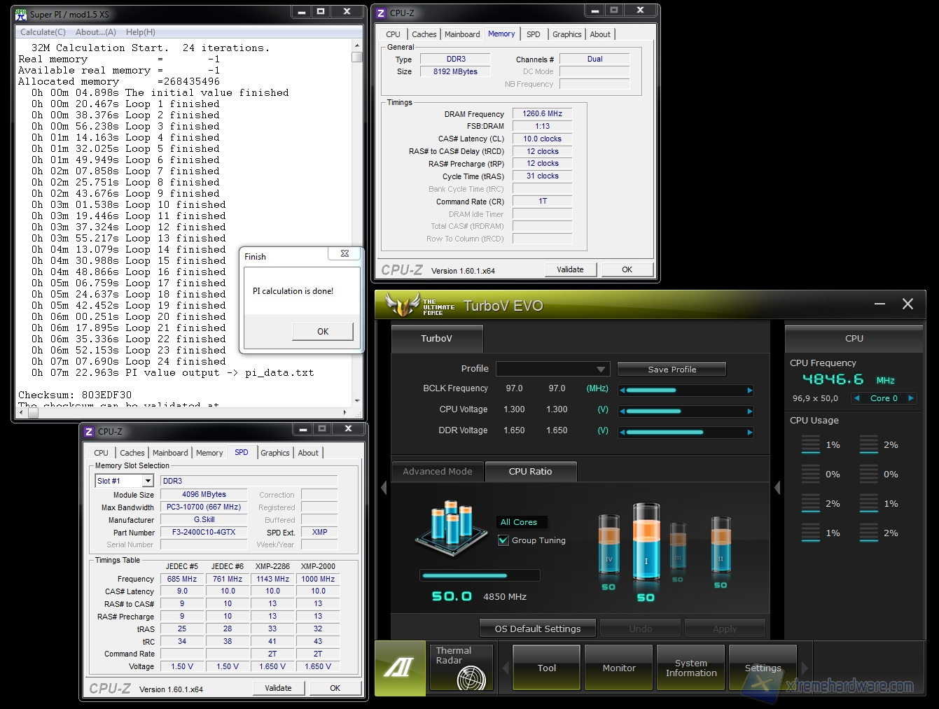 Per dare un’idea del potenziale delle memorie, progettate principalmente per lavorare in ambito dell’overclock, abbiamo incrementato sensibilmente la frequenza del processore oltre quella di default. Per poter far ciò e riuscire al contempo a dissipare il calore prodotto dalla CPU, abbiamo utilizzato un sistema a Cascade costruito dalla ditta Dimastech che si avvale di 2 compressori appunto a doppio stadio. Per il test, abbiamo adoperato un difficilissimo SuperPI 32M sinonimo di stabilità per le memorie in caso di superamento, nonché molto sensibile agli incrementi di frequenza delle stesse. Questo test viene utilizzato anche in campo agonistico ed i cui risultati possono essere confrontati sul sito Hwbot. Le memorie pur rimanendo sulla soglia di voltaggio standard e senza rilassare i timing, sono riuscite a raggiungere la ragguardevole frequenza di 2532 MHz. Di seguito riportiamo alcuni screenshot effettuati a frequenze della CPU e delle memorie via via crescenti.